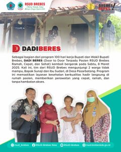 Sebagai wujud kepedulian terhadap kesehatan masyarakat, Bupati Brebes, Paramitha Widya Kusuma, SE MM, dan Wakil Bupati Brebes, Wurja, SE, terus menunjukkan komitmen mereka dalam program 100 Hari Kerja Brebes Beres. Salah satu inovasi yang dihadirkan adalah DADI BERES (Door to Door Terpadu Pasien RSUD Brebes Ramah, Cepat, dan Sehat), program layanan kesehatan yang hadir langsung ke rumah warga yang membutuhkan.