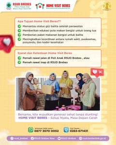 Brebes, 20 Februari 2025 – Dalam upaya mempercepat penanganan stunting dan gizi buruk di Kabupaten Brebes, RSUD Brebes meluncurkan program inovatif Home Visit BERES (Bersama Eliminasi Risiko Stunting dengan Home Visit). Program ini merupakan pengembangan dari Klanting Kabur (Kelas Anak Stunting Karo Gizi Buruk) dan Walinting Kabur (WhatsApp Kelas Interaktif Stunting Karo Gizi Buruk) yang telah berjalan sebelumnya. Home Visit BERES hadir untuk memberikan pelayanan kesehatan yang lebih komprehensif dengan pendekatan berbasis komunitas.