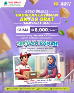 Bekerja sama dengan JNE Cabang Brebes RSUD memberikan layanan SIPOSAN RAMAH dimana Sahabat Brebes cukup membayar Rp. 8.000,- , Sahabat Brebes tinggal duduk di rumah nanti obat kita antar dengan aman dan nyaman pastinya