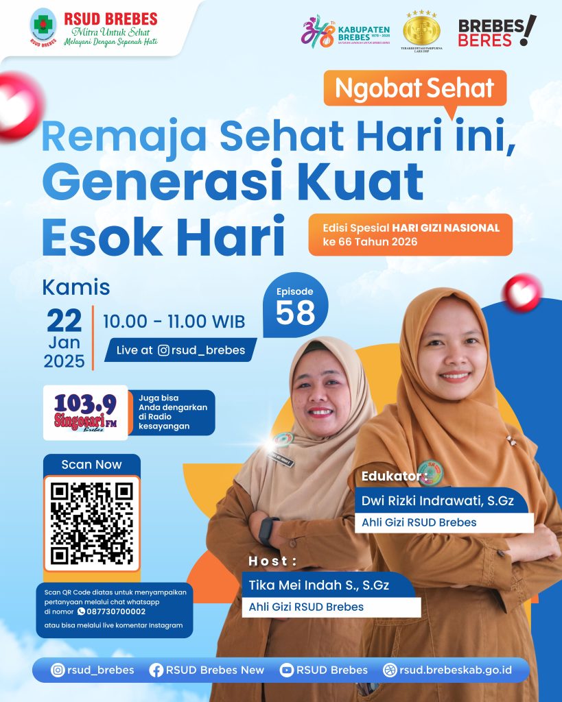 Dalam rangka memperingati Hari Gizi Nasional ke-66, RSUD Brebes kembali menghadirkan NGOBAT SEHAT sebagai ruang edukasi dan diskusi seputar kesehatan, khususnya pentingnya pemenuhan gizi seimbang pada remaja sebagai fondasi terciptanya generasi yang sehat, cerdas, dan berdaya saing di masa depan.