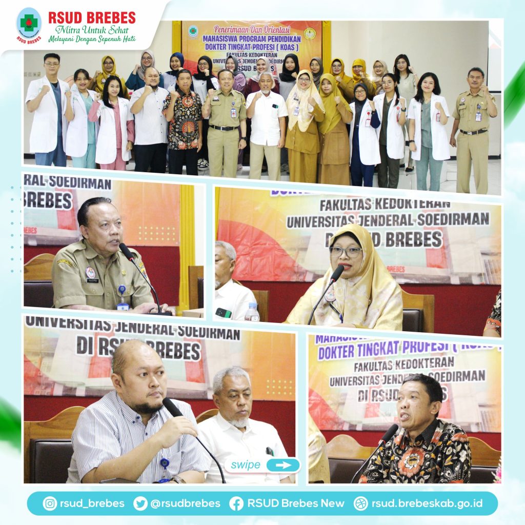 Senin, 9 September 2024 berlokasi di Ruang Aula RSUD Brebes, telah berlangsung kegiatan perdana Penerimaan dan Orientasi Mahasiswa Program Pendidikan Dokter Tingkat Profesi (koas) Fakultas Kedokteran Universitas Jenderal Sudirman Tahun 2024 sejumlah 13 mahasiswa.