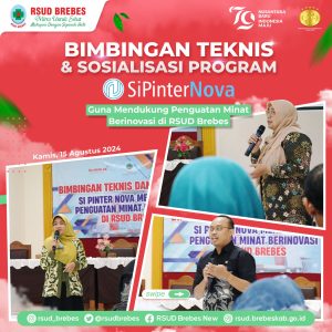 RSUD Brebes menyelenggarakan Bimbingan Teknis dan Sosialisasi tentang Sistem Informasi Pengelolaan Terintegrasi Inovasi (SI PINTER NOVA) di Aula RSUD Brebes pada Kamis, 15 Agustus 2024. Bimtek tersebut dilaksanakan dalam rangka penguatan minat berinovasi di lingkungan RSUD Brebes.