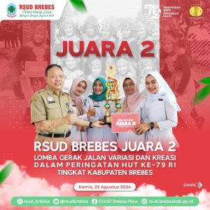 Memeriahkan HUT Ke-79 Kemerdekaan Republik Indonesia, RSUD Brebes mengirimkan kontingen Tim Putri pada cabang perlombaan Gerak Jalan Kreasi dan Variasi yang diselenggarakan oleh Panitia Tingkat Kabupaten Brebes. Pada Kamis, 22 Agustus 2024 bertempat di Pantai Randu Sanga Indah, Brebes. Lomba pada kategori umum putri ini diikuti oleh 18 peserta salah satunya Tim dari RSUD Brebes.