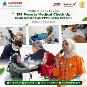 Sabtu, 4 Januari 2025 – RSUD Brebes sukses melayani 134 peserta Medical Check-Up (MCU) dari berbagai kategori, meliputi Calon Jamaah Haji, Pegawai Pemerintah dengan Perjanjian Kerja (PPPK), Calon Pegawai Negeri Sipil (CPNS), dan peserta Program Sarjana Penggerak Pembangunan Indonesia (SPPI). Kegiatan ini berlangsung di hall gedung penunjang RSUD Brebes.