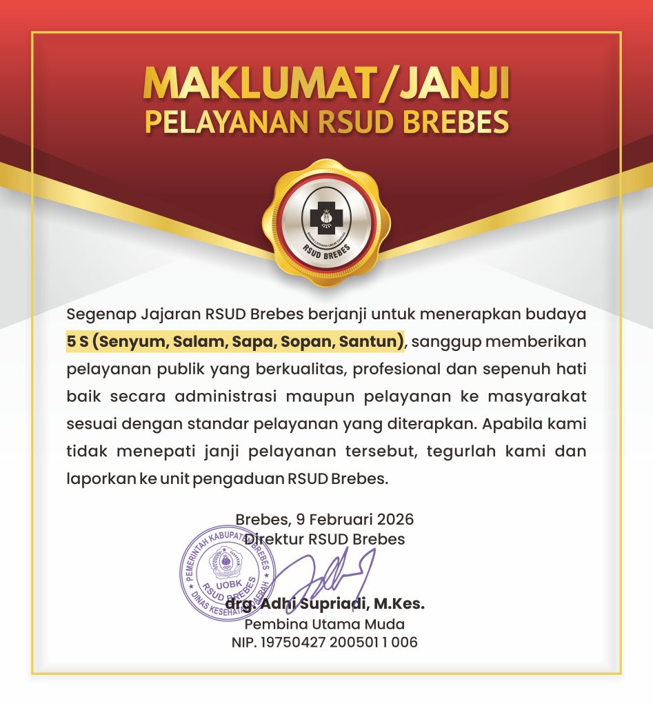 Segenap Jajaran RSUD Brebes berjanji untuk menerapkan budaya 5S (Senyum, Salam, Sapa, Sopan, Santun), sanggup memberikan pelayuanan publik yang berkualitas, profesional dan sepenuh hati baik secara administrasi maupun pelayanan ke masyarakat sesuai dengan standar pelayan yang diterapkan. Apabila kami tidak menepati janji pelayanan tersebut, tegurlah kami dan laporkan ke unit pengaduan RSUD Brebes.
